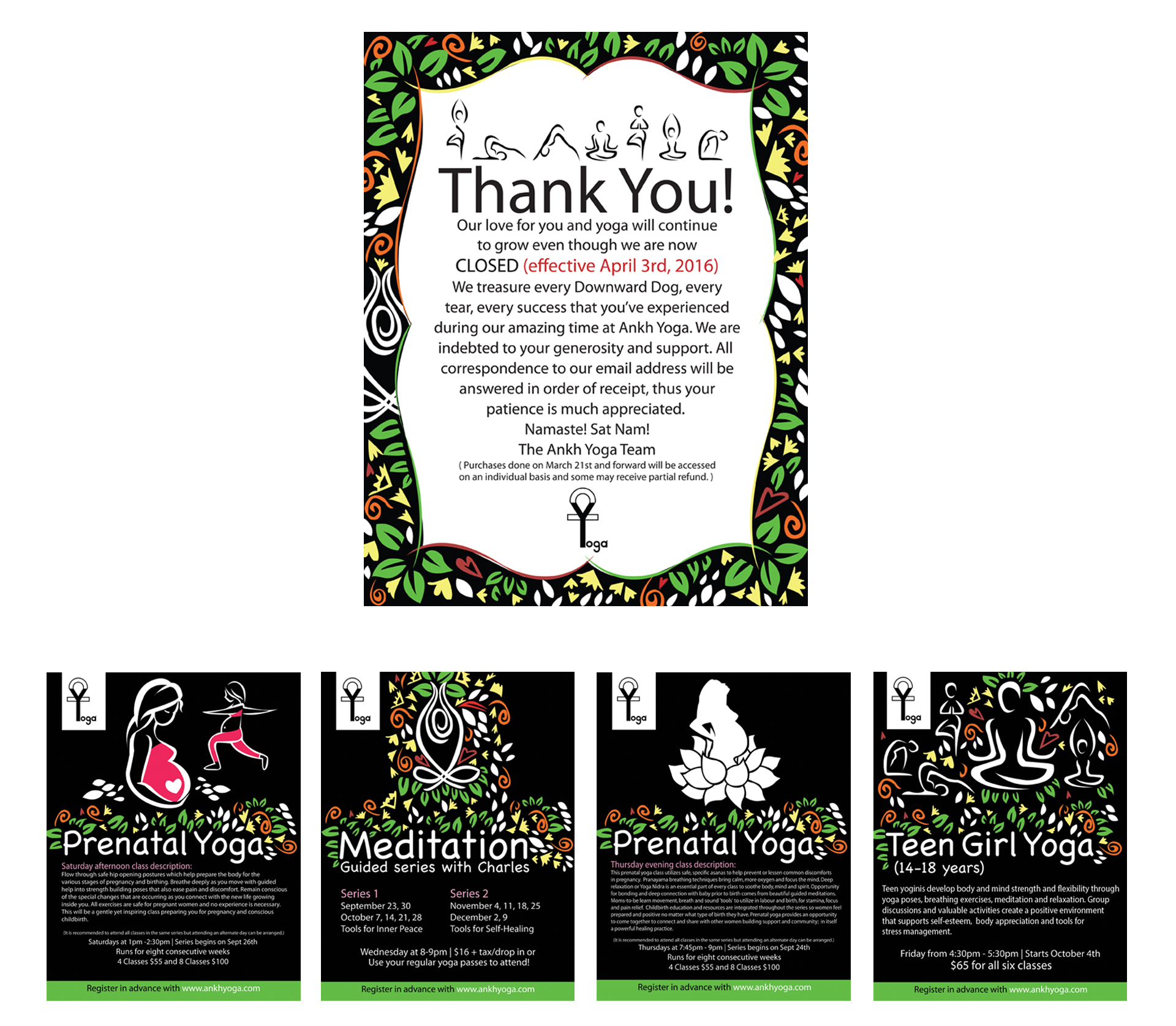 Designed a variety of posters for Ankh Yoga, Yoga Studio in Danforth Toronto. Created illustrations for all posters.
