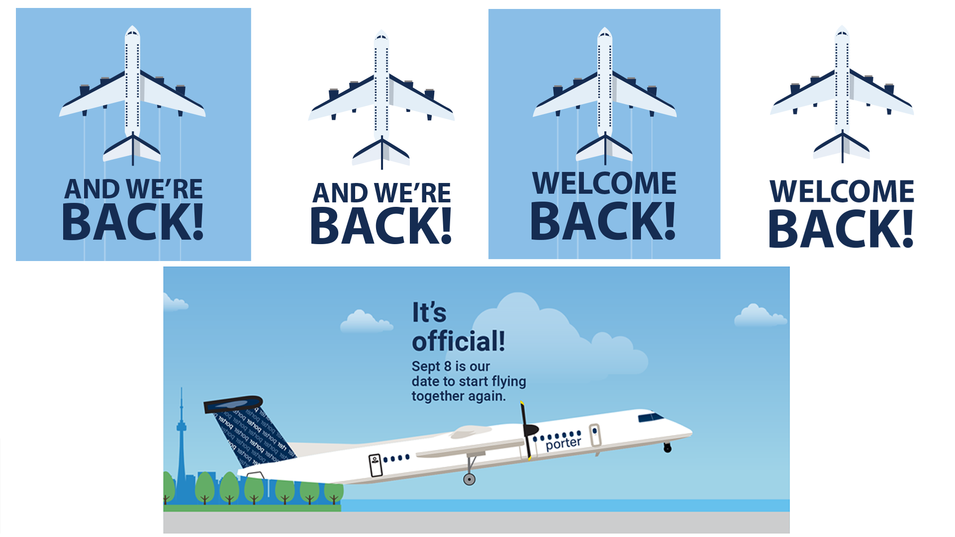Illustrations and graphic created for social media, And we're back and Welcome back. Covid-19 illustrations for Practice Good Hygiene. Love is in the air social media campaign and the porter plane your in information.